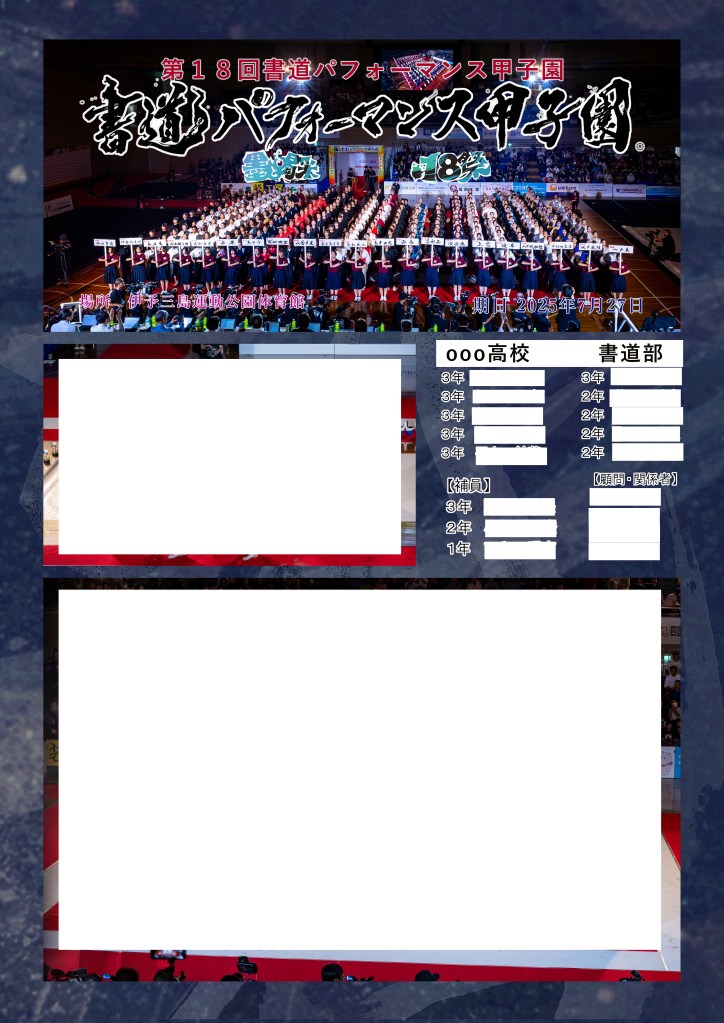 写真サイズ2L、A4、データは、おもいで.com [書道パフォーマンス甲子園写真展示室]で閲覧、購入できます。